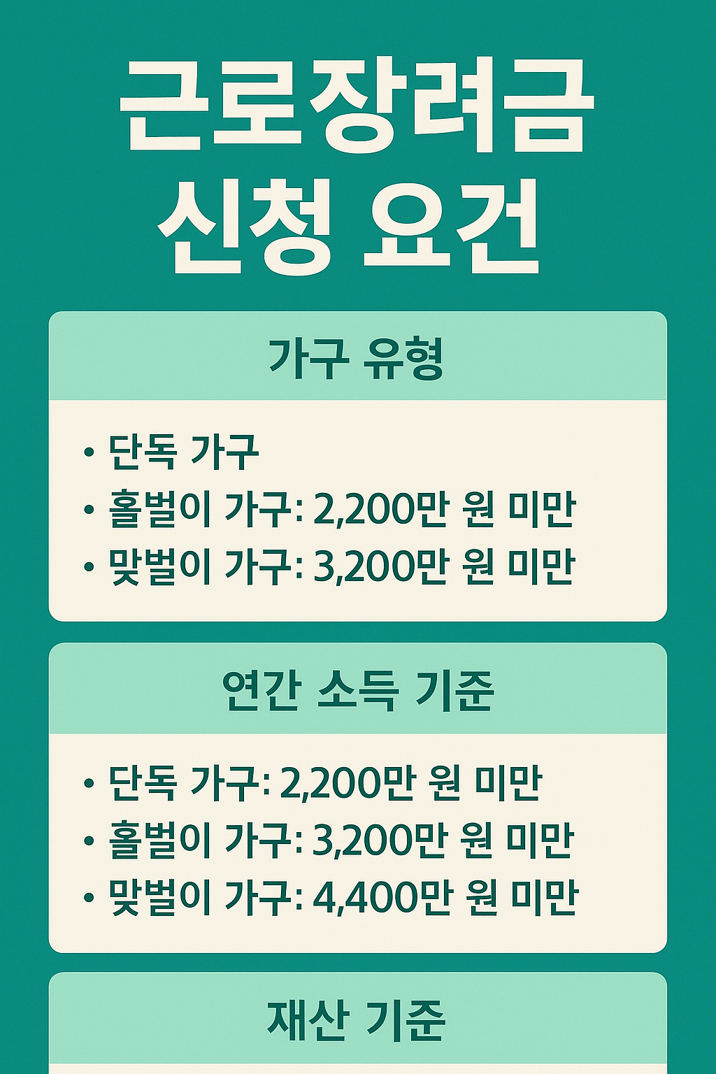 2025년 기준 근로장려금은 다음 3가지 요건을 모두 충족해야 신청이 가능합니다.